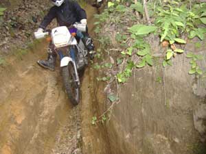 エクストリームにえぐれたV字道。 低速走行に備え、わたしのDTはスイッチカバーをOPEN ! リニア式ファンを稼動させ強制冷却状態に入る。 いささか最低地上高の低いNX(画像上)は苦戦中。 逆落としに入るつーだ氏(画像左)。モトクロスコースだと飛んでしまえば済むところが、林道ではまじめに降りなくてはならず怖いらしい。 |
