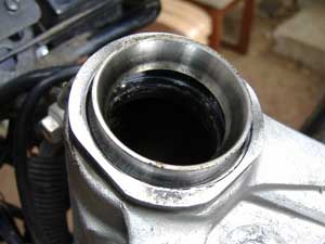 レースを打ち込んだら、ステムシャフトを下から差し込む。 上のベアリングをシャフトに通し、ロックナットをかけてやる。 ある程度ロックナットを締めこんだら、トップブリッジをはめてやる。 あとはフォークをクランプし、ガタの調整をしてトップナットを規定トルクで締めて終わりだ。たまにトップナットをバカヂカラで締めるヤカラが居るが、百害あって一利無しである。 |
