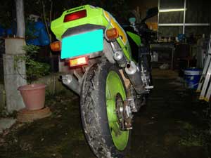 | あとは、タイヤやらエアクリーナーボックスやらのパーツを元通りに組んで作業終了。注意したいのはマフラー。排気漏れがないかエンジンをかけて確かめる。・・・なんて、きちっとやってたつもりがリヤブレーキキャリパーを付け忘れて走り出してしまった。スグに気づいたから良かったけどヘタすりゃホイールに巻き込むところだった。「弘法も筆のあやまり」とか「猿も木から落ちる」とか「河童の川流れ」とか・・・。 | ![]() |