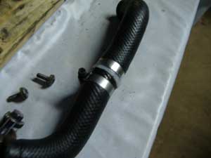 ホームセンターの水道コーナーにあった19Φのホースジョイント。ホースの内径は20Φだが、けっこうグリグリ押してやらないと入らないくらいのキツさはある。少しぐらいゆるかったとしてもあとでクランプで締めてやるので問題なし。シリンダヘッド側、ラジエータ側ともに曲がっているホースが必要なのでスペアのラジエータから外したホースとあわせ2コイチで使う。2つのホースを適当なところでぶった切りジョイントをかましホースを連結する。ジョイントとホースはいちおうシンエツKE45でシーリングしておいた。 |