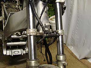 アウターチューブのクランプ部分が切腹したフォークをとりあえず車体につけておいた。フルードをカップから流し込み、キャリパーのブリーダバルブにホースを差込み注射器でフルードを吸い出す。あとは、レバーをスコスコ握ってエア抜きをする。エア抜きはキャリパー側ではなくマスターシリンダからするのが基本。空気は上に上がってくるのだから当然だ。あらかたエアが抜けたら、キャリパー側に溜まっていたエアを抜いて終わり。こうすればムダにフルードを消費することもなく短時間でエア抜きを終えることが出来る。 |
