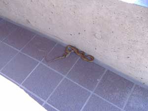 駒止トンネルの休憩所にあった温度計。あまりの暑さにヘビも日陰で休んでいた。