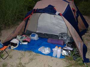 キャンプツーリングには必須のちゃぶ台をセッティングして準備は完了である。あ、チェーンには持参の2ストオイルを塗っておく。 |